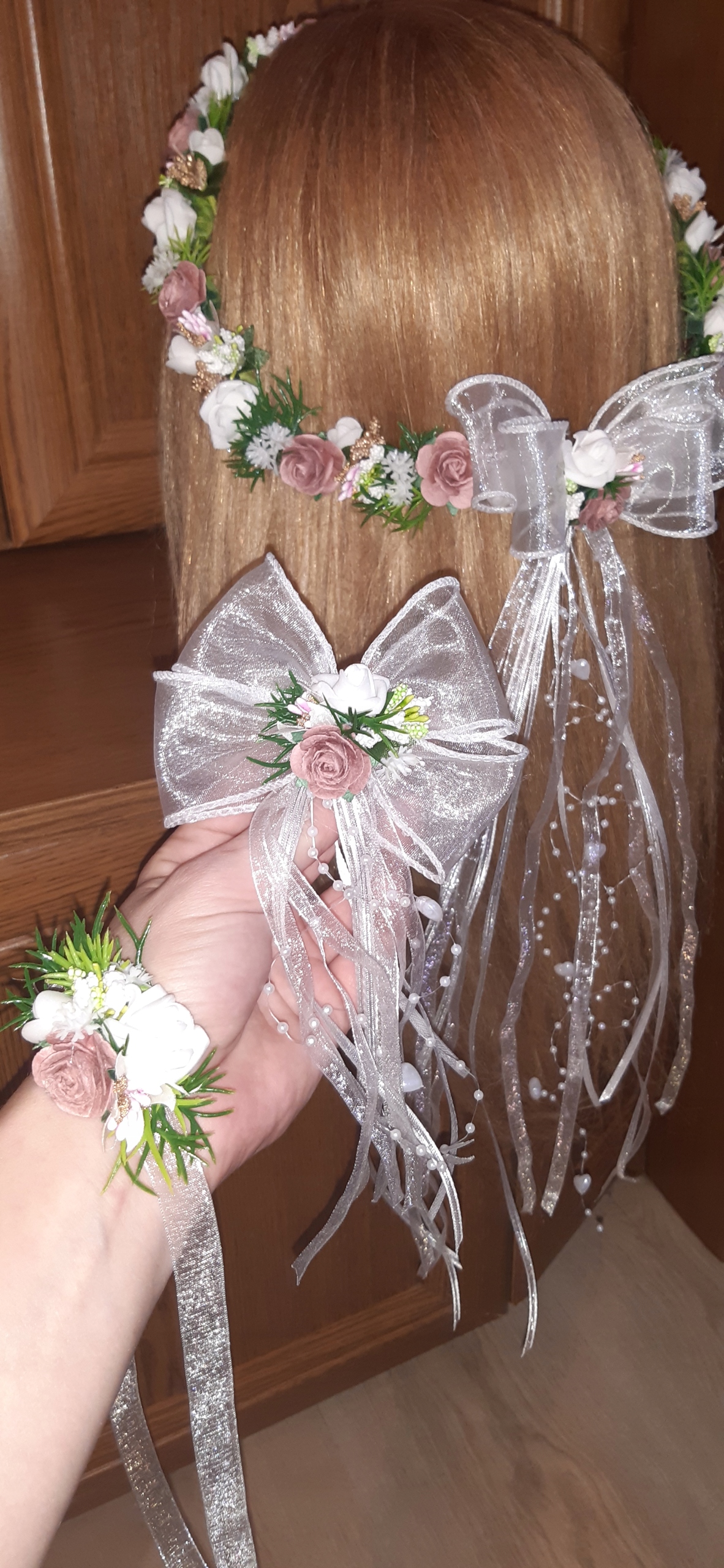 WIANEK KOMUNIJNY BIAŁO PUDROWY RÓŻ ASPARAGUS JAK ŻYWY REGULOWANY ZESTAW