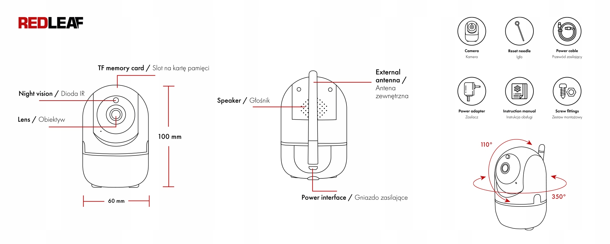Камера Redleaf IP Home Cam 100 розроблена таким чином, що в контрольованому просторі немає «мертвих зон». Усе завдяки ширококутному об’єктиву та великому діапазону рухів поворотної головки, яка переміщується на 350° по горизонталі та на 110° по вертикалі. У будь-який момент ви можете дотягнутися до свого смартфона з встановленим додатком для дистанційного керування та перегляду та в режимі реального часу проаналізувати кожен сантиметр будинку, офісу чи складу, де знаходиться пристрій.