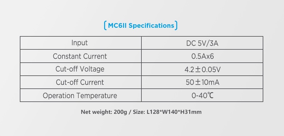 Метод зарядки TC/CC/CV-це триступеневий процес зарядки лілей-іонів, який забезпечує підтримку комірки в хорошому стані шляхом завантаження правильним струмом на кожному етапі та кінцем процесу зарядки праворуч час. Індивідуальні стадії процесу TC/CC/CV: • Фаза TC: Виписані клітини нижче 2,9 В "збуджуються" з нижчим струмом. • Фаза CC: Після досягнення 2,9 В комірка завантажується фіксованим струмом від 0,05A до 0,5A (залежно від використовуваного джерела живлення). • Фаза резюме: Коли посилання майже заряджається, зарядний пристрій переходить на зарядку зі зменшенням струму, поки він не досягне 4,2 В на комірці. Після досягнення 4,2 В процес зарядки завершується - акумулятор повністю заряджається. Битви з напругою 4,06 В або вище, ставляться до зарядного пристрою як заряджене. Щоб поповнити такий акумулятор, покладіть його в зарядний пристрій, перш ніж перетворити його на джерело живлення. Заряджені батареї, що залишилися в зарядному пристрої, пройдуть природний процес самоконпоненту. Зарядка відновиться, коли напруга акумулятора опуститься нижче 4,06 В, зарядний пристрій XTAR VC2 має функцію реактивного глибокого -розфарбованого клітини та клітин 0 В. Просто покладіть глибоко розряджений акумулятор у зарядний пристрій VC2, як і при нормальній зарядці - зарядний пристрій виявить виписану комірку і спробує її знову активувати. Увага! Клітини, що викидаються нижче певного рівня, незворотні, і їх реакція може бути неможливою. Уникайте занадто глибокого розряду батарейних батарей - це може призвести до значного зниження їх міцності та потужності або призведе до їх повної несправності. Використовуючи джерело живлення від зовнішнього джерела живлення, XTAR уникає нагрівання клітин, які можуть спричинити їх швидший знос. Завдяки цьому, температура акумулятора, заряджена в MC6 II, збільшиться щонайменше на 15 градусів. Специфікація: