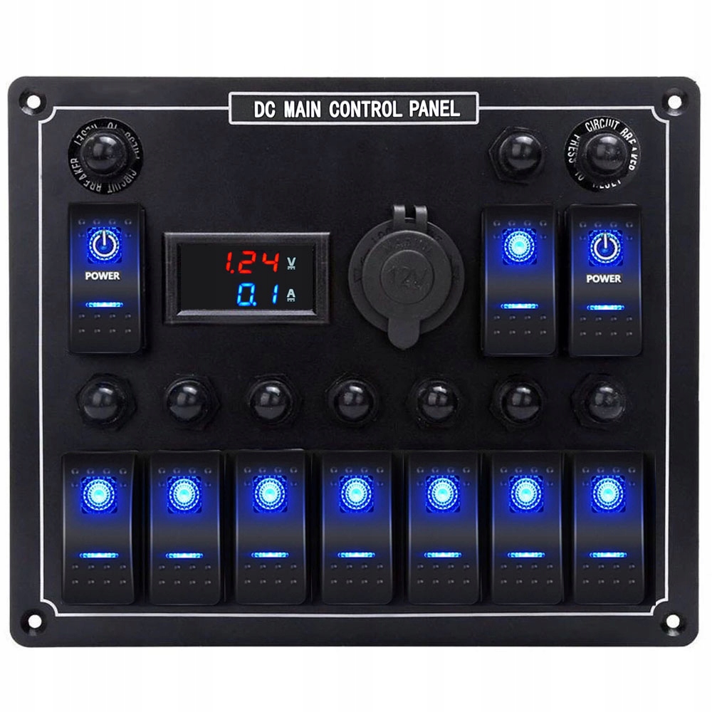 Професійний електрощит, 10-контурний комутатор з автоматичними запобіжниками, вольтметром, амперметром і гніздом для прикурювача. Дошка підсвічується синім кольором. У набір входять ідентифікаційні наклейки та гвинти. Гніздо прикурювача, можна легко замінити на USB.