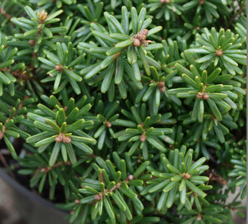 - хвоя, блискуча, яскраво-зелена, з крейдяно-білою нижньою стороною, радіально розташована навколо пагонів. Нижні частини голок непомітні. Товсті, оголені бруньки.