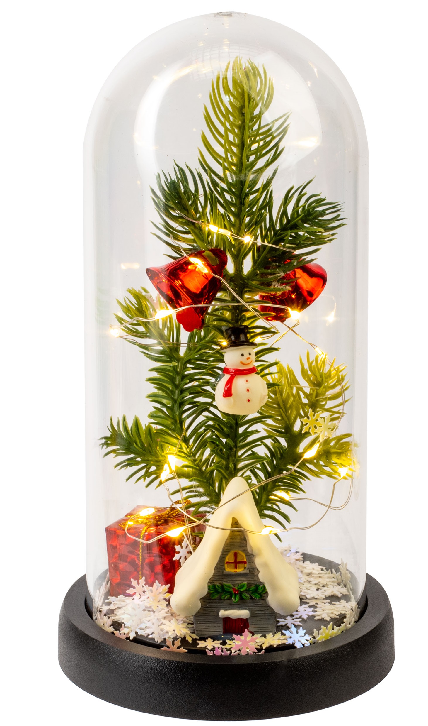 Новорічна ялинка в прозорому акриловому куполі зі світлодіодним освітленням та мініатюрні прикраси. Чудово підійде як прикраса будь-якого будинку, де буде панувати святкова атмосфера. Ви також можете використовувати його як нічник. Його тепле світло освітлить будь-яку кімнату