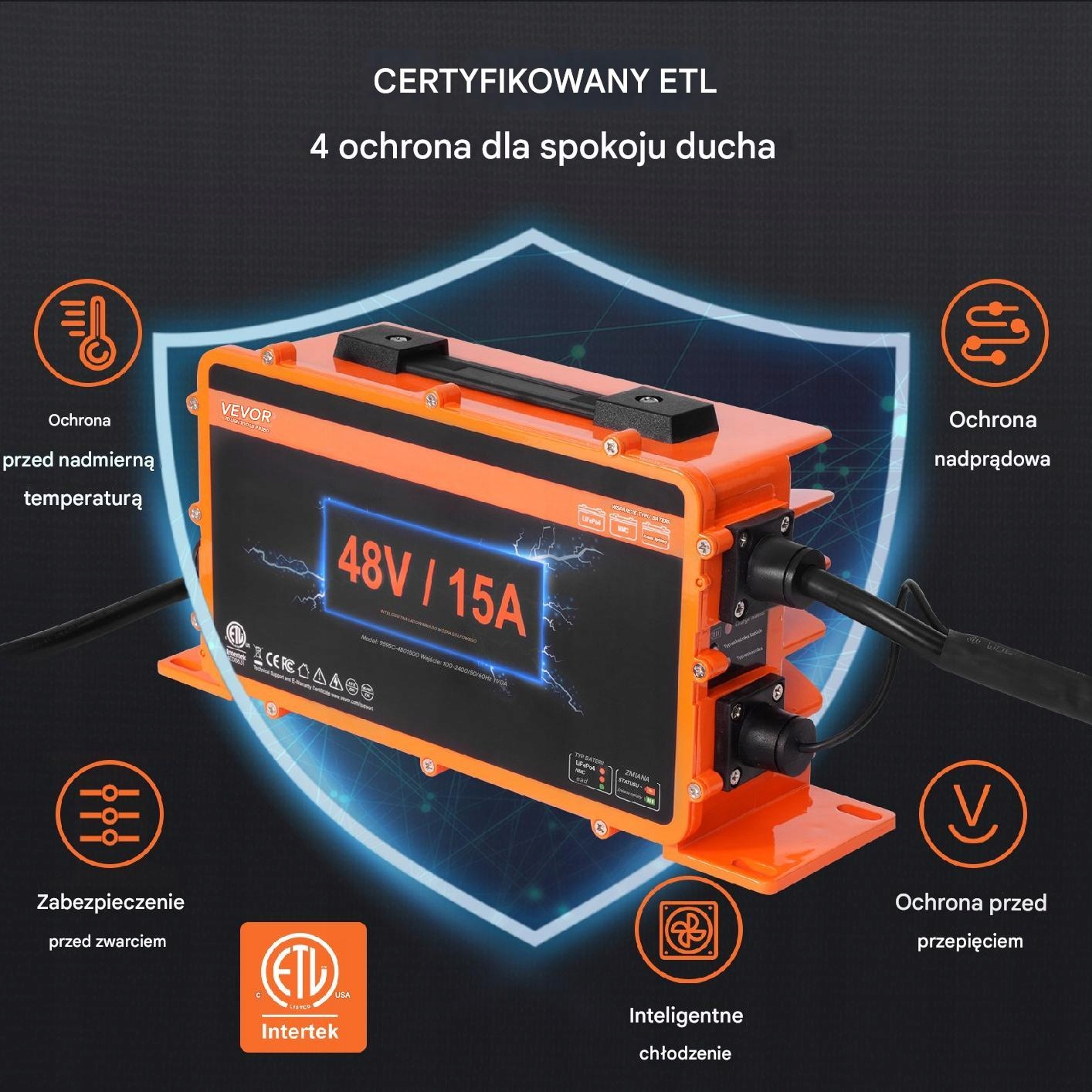Наш зарядний пристрій для батарейних батарей для гольфу повністю сумісні з кислотними акумуляторами, NMC та LifePO4 . Він має сертифікат ETL та клас захисту IP67, що дозволяє йому витримати складні зовнішні умови. Інтелектуальне визнання низької напруги забезпечує легку зарядку вивантажених батарей. Зарахуйте свою водолазку з повною довірою!