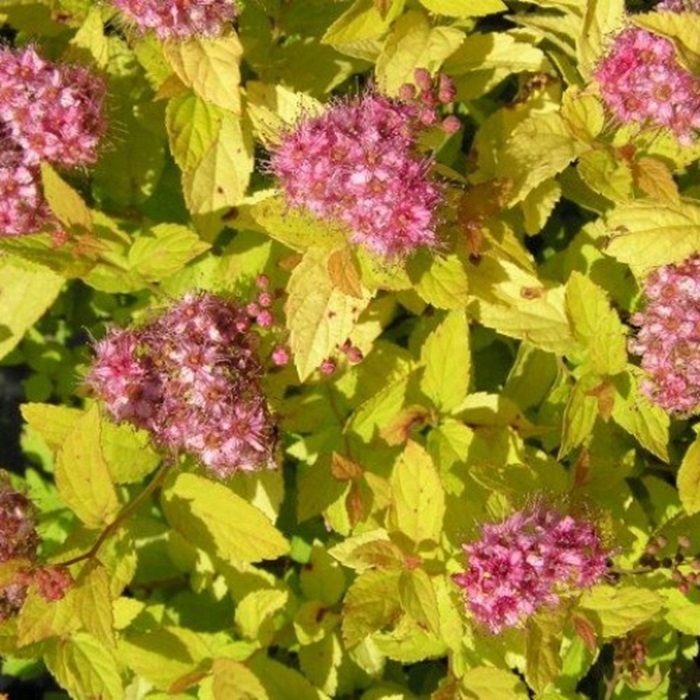 рожеві, маленькі квіти, зібрані в плоских суцвіттях в кінці цьогорічних пагонів. Він рясно цвіте в червні до серпня.