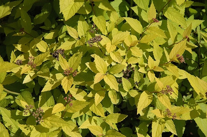 Японські свічки - це низький, міцний чагарник з рожевими квітами та світло -жовтими листям.