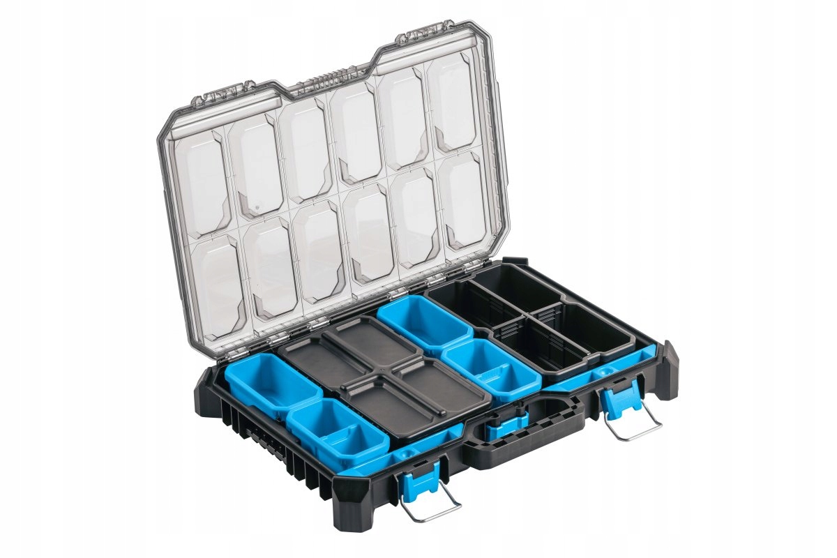 Органайзер для валіз з кришкою з полікарбонату, використовується для зберігання будівельних, майстерень і т.д. Створена для вимогливих користувачів. Він оснащений 5 функціональними чашками, які дозволяють зберігати дрібні інструменти, аксесуари та інші предмети. Органайзер дозволяє легко з'єднувати з іншими елементами модульної системи скринь. Міцні застібки ABS і металеві петлі забезпечують безпеку при транспортуванні виробу. Корпус органайзера виготовлений з полімерів. Гарантує захист від затоплення та пилу. Призначений для професійного використання. Він чудово працює в багатьох галузях, таких як будівництво, промисловість, автомобільна промисловість і логістика.