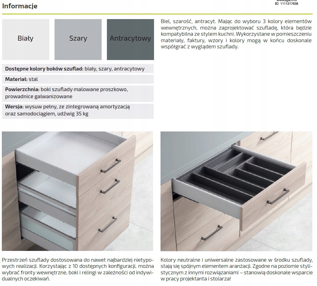 Ящик Matrix S Повна свобода розташування полегшує проектування кухні, яка буде функціональною не лише з точки зору ергономіки, але й з точки зору дизайну та естетики. Вибираючи шухляду Matrix S35 від Häfele, ви отримуєте можливість створити шухляду відповідно до ваших індивідуальних потреб і вимог. Велика кількість конфігурацій, повна сумісність внутрішніх елементів і 3 кольори на вибір роблять систему, яка виходить за рамки стандартного уявлення про дизайн.