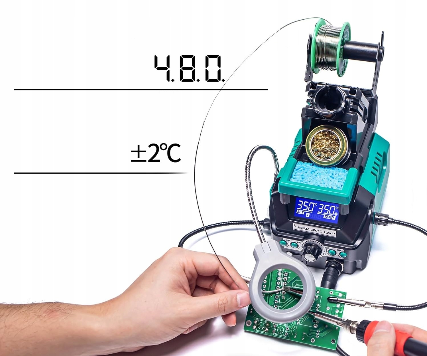 Ця паяльна станція оснащена розширеними функціями, точними функціями та основними інструментами та аксесуарами для паяння/відпаювання. Станцію можна використовувати для загального паяння, прогресивної та точної пайки, професійного ремонту та інших професійних застосувань. Ми створили цю паяльну станцію для вас, щоб ваш робочий процес був більш ефективним і зручним.