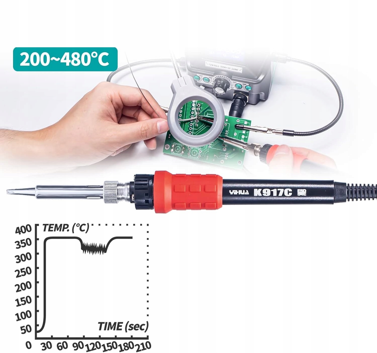 - Ви можете вибрати температурний діапазон від 200 до 480°C, а вбудована програма стабілізації температури PID підтримує постійна температура для плавного паяння. Подвійний світлодіодний дисплей дозволяє одночасно перевіряти фактичну температуру нагрівального елемента та встановлену температуру станції.