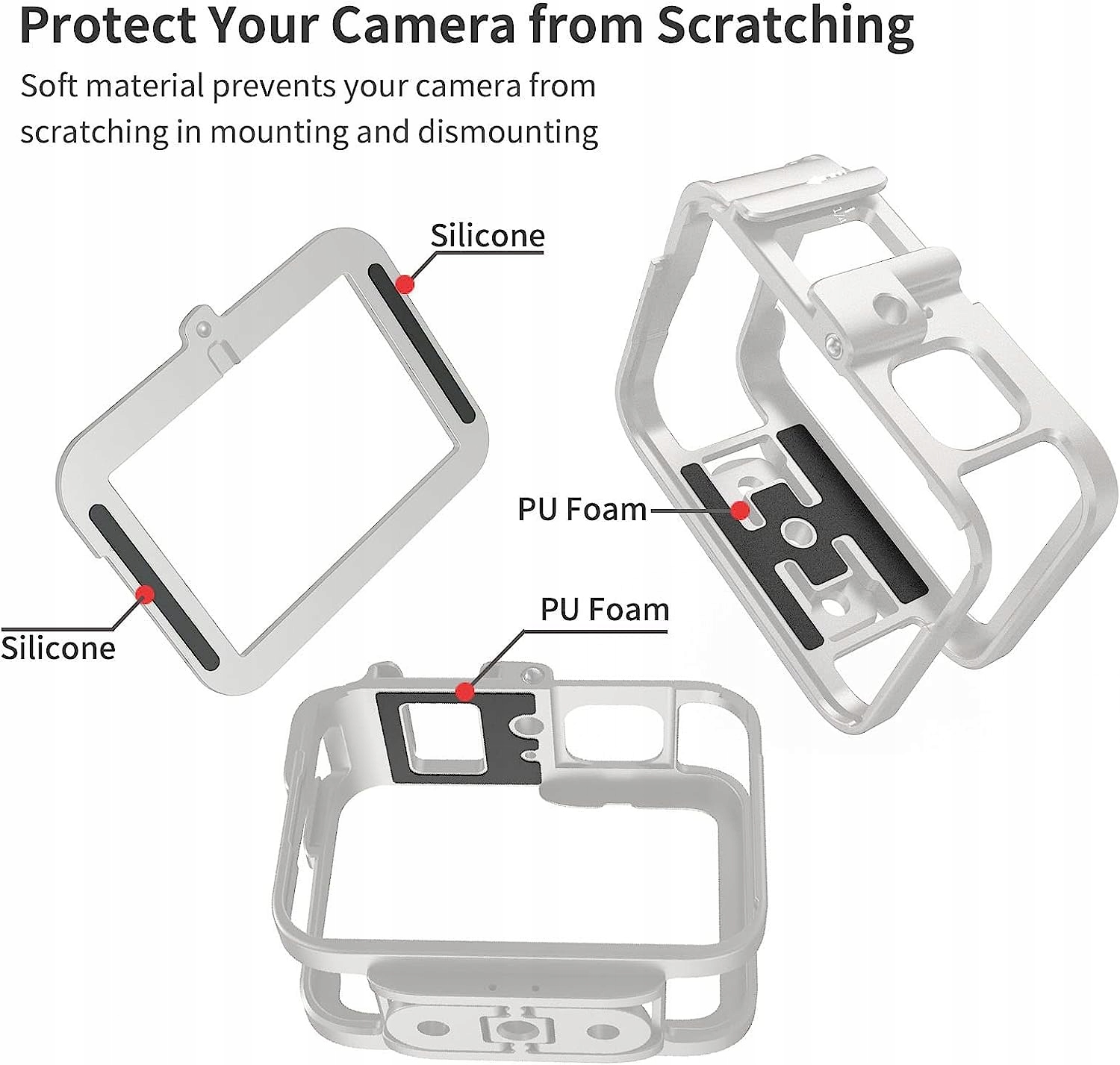 【Дивовижний захист】 Вставте силіконову прокладку всередину, клітка щільно прилягає до камери без вібрації, використовується для зйомки швидкісних видів спорту, таких як їзда на велосипеді та лижах.