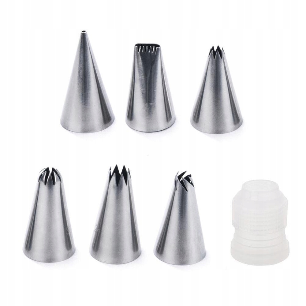 шість із шести різних порад щодо прикраси нержавіючої сталі та двостороннього пластикового адаптера. Поради - це універсальне відповідність різним типам кондитерських виробів.