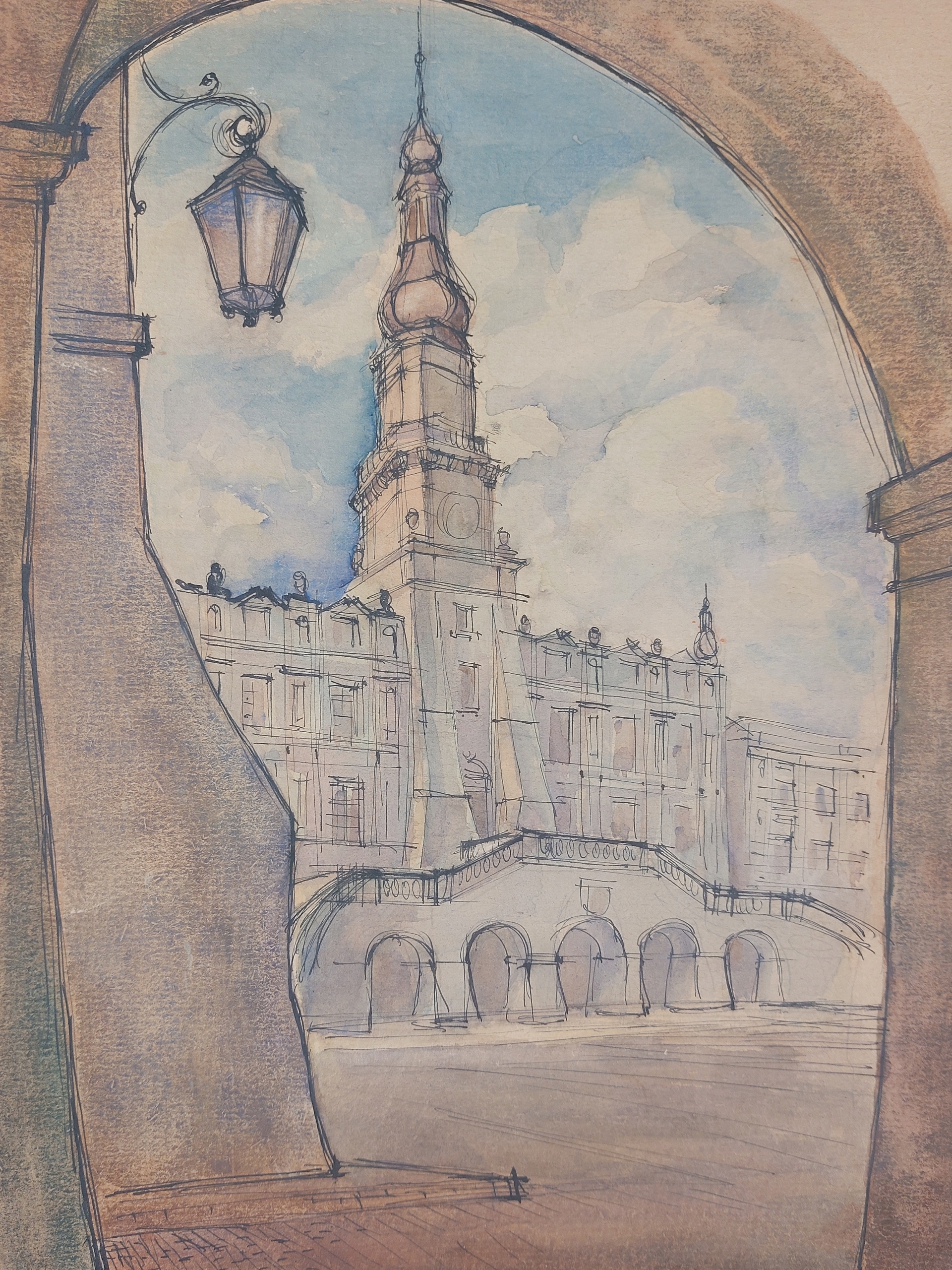 Zamość Ratusz renesansowy w rynku tusz podmalowany akwarelą niesygnowany