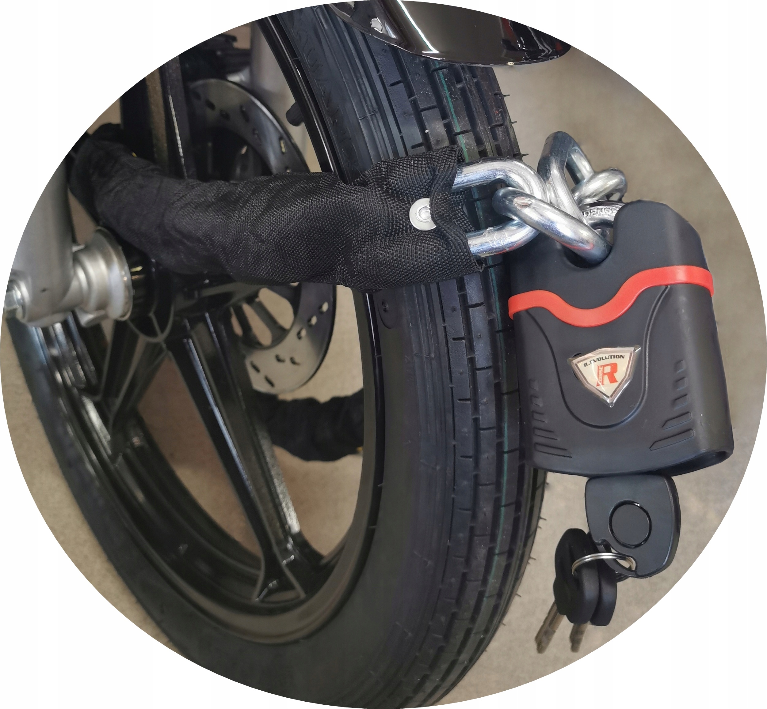 Замок виготовлений з міцного матеріалу і використовується для фіксації мотоцикла, скутера, мопеда і навіть велосипеда. Світлодіодне підсвічування в ключі дозволяє ефективно відкривати замок у темряві.