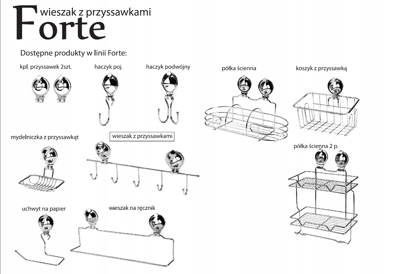 Лінія Forte — це серія металевих вішалок і полиць, які монтуються без необхідності свердління. Вони мають надійне кріплення за допомогою міцної гумової присоски. Вони виготовлені з нержавіючої сталі. Вони прості в установці.