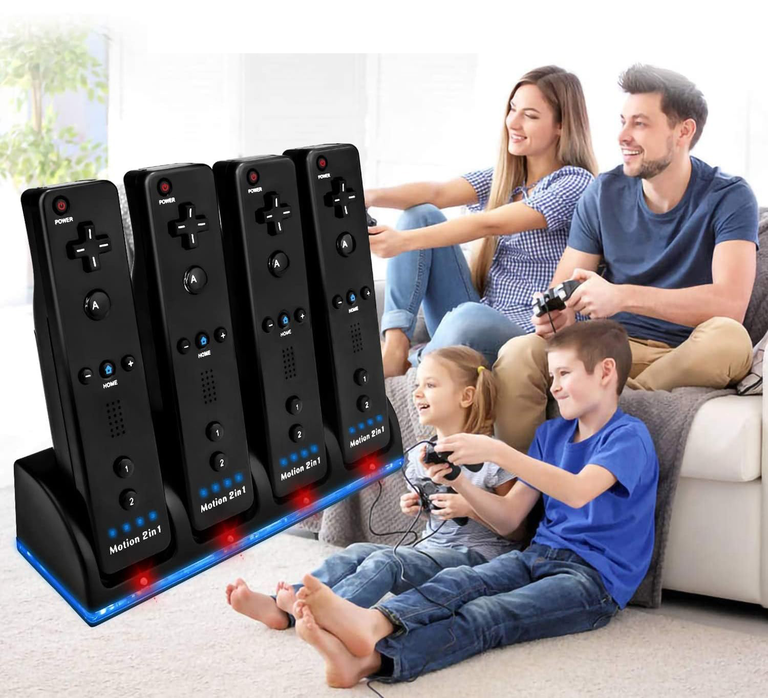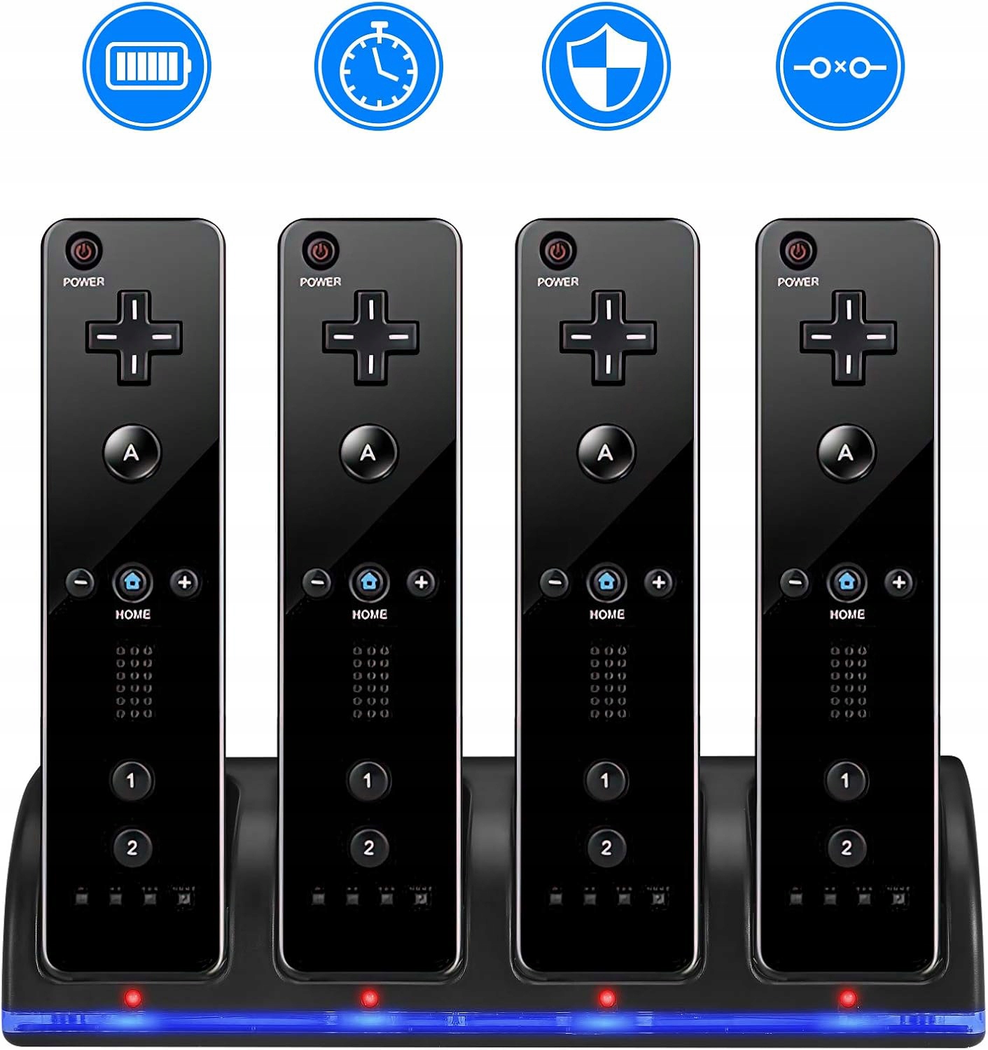 🎁🎁🎁 Нагадування про заряджання- світлодіодне світло світиться від основи док-станції, щоб показати стан зарядки акумулятора. Під час заряджання індикатор світиться червоним, а коли повністю заряджений – синім. Ви можете заряджати 4 контролери одночасно за допомогою цього зарядного пристрою Wii.