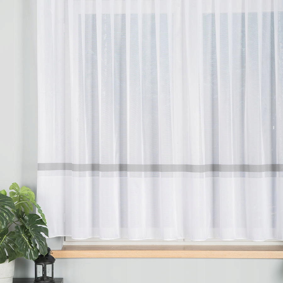 Класична Сніжна -біла Жаккарда з більш ніжною сітчастою конструкцією з білим поясом більш товстого та тонким сірим ремінцем у дні, що дають у великій кількості світла і виглядає прекрасно у вікні у кожній кімнаті. Вічна, біла завіса високо на 155 см. Завіса має вагу, що робить її ще приємнішою. Виріжте сторони, вгорі заводського краю - потребують подолу.