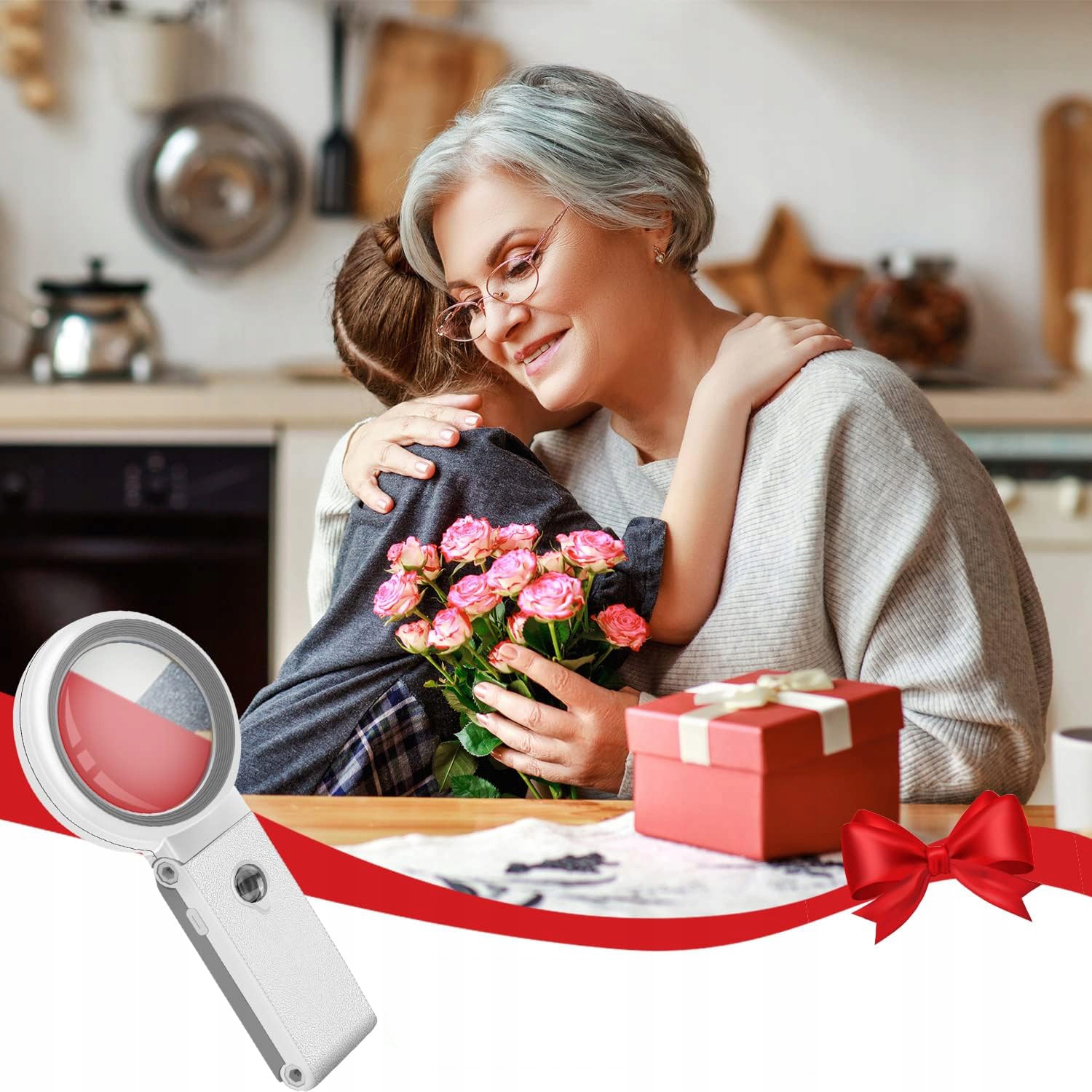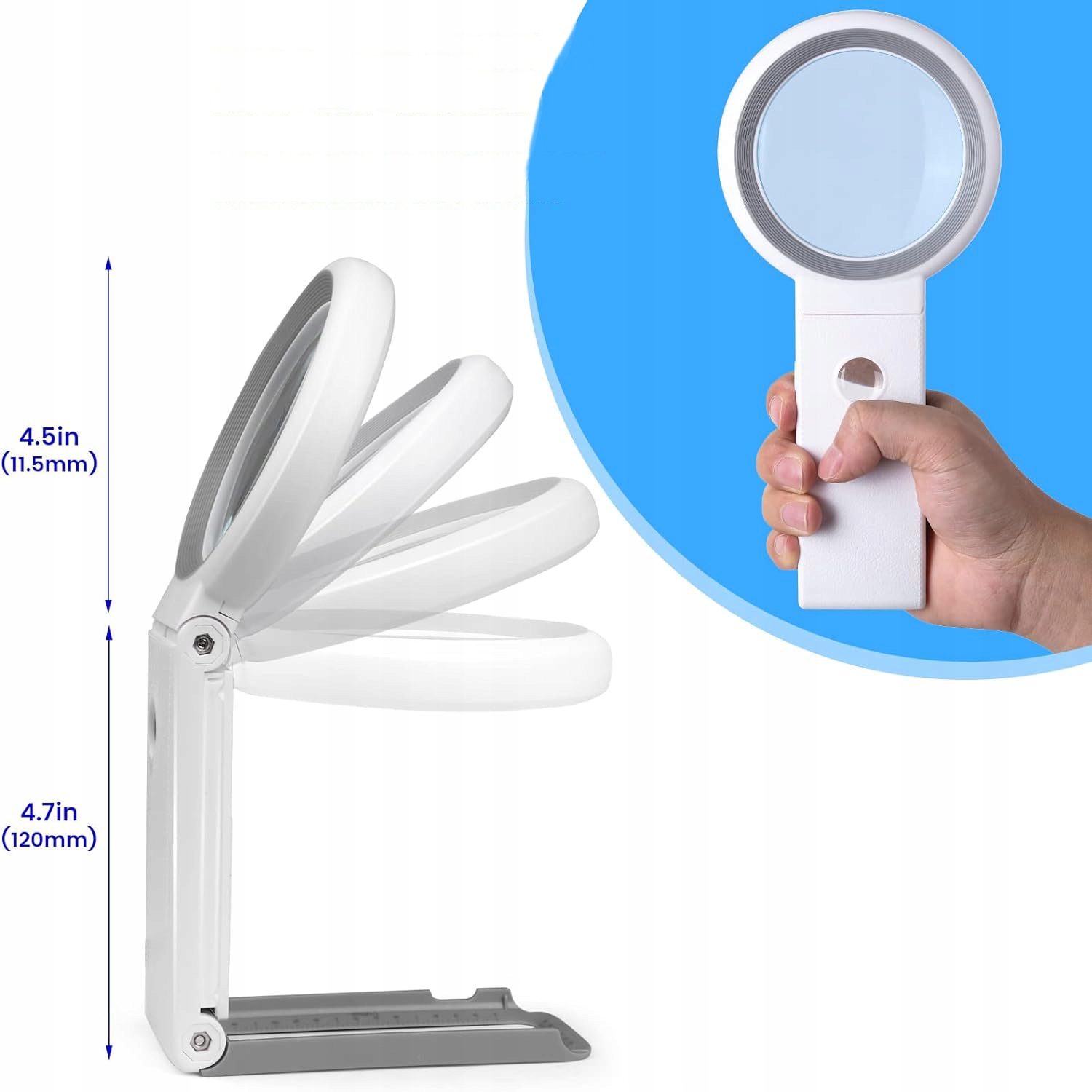 Складна підставка дозволяє встановити лупу на стіл. Це гарне рішення для довготермінового читання та роботи поблизу. і 6 теплих світлодіодів), 3 легкі кольори на вибір Підсвічування вимагає 3 батарейних батарей AAA (не включені). Світло допомагає вдосконаленому в кращому читанні. є легким, а ручка зручна. Якщо ви використовуєте його як стояче лупу, ви можете відрегулювати об'єктив і кут стенду до ваших потреб. Це може звільнити руку.