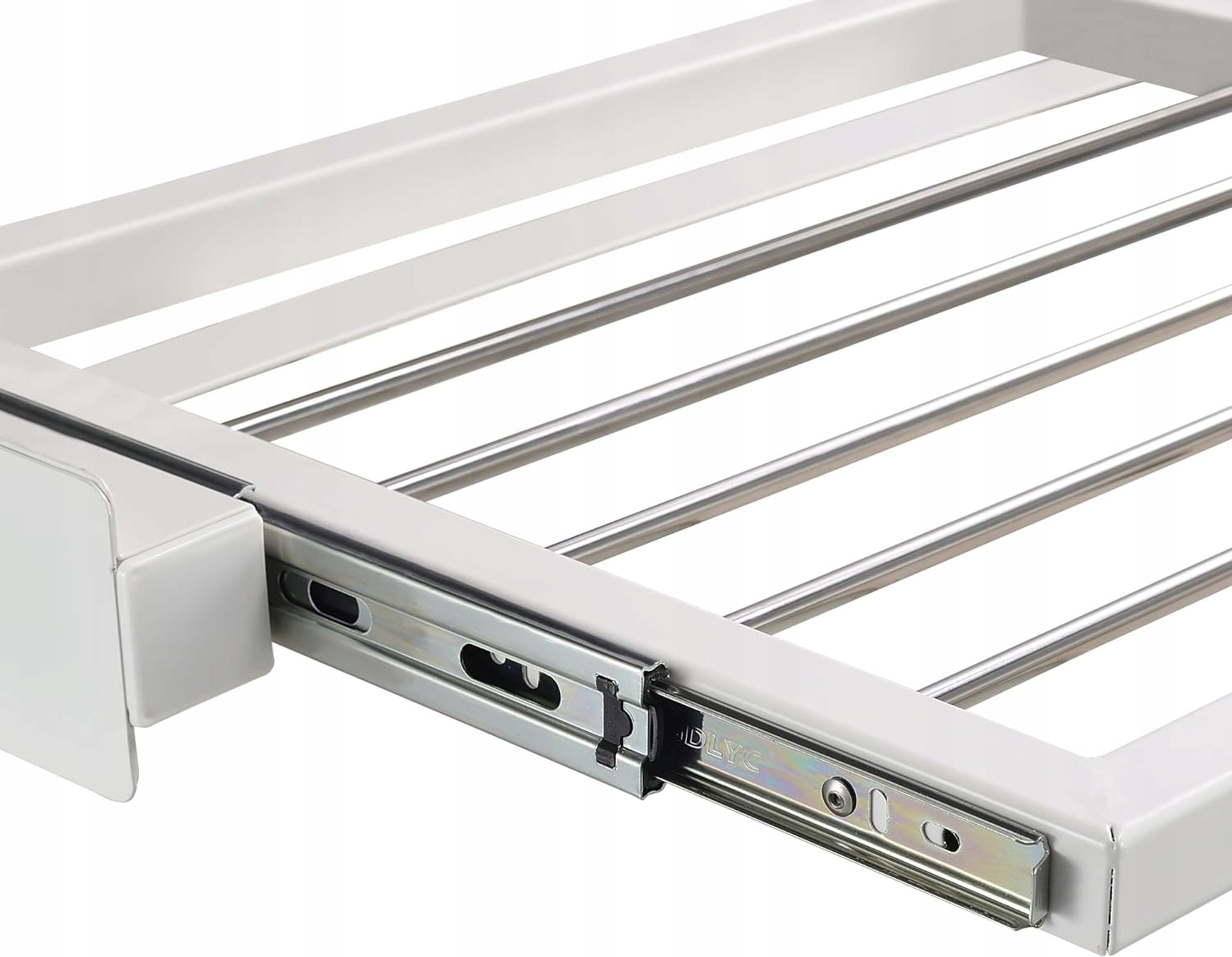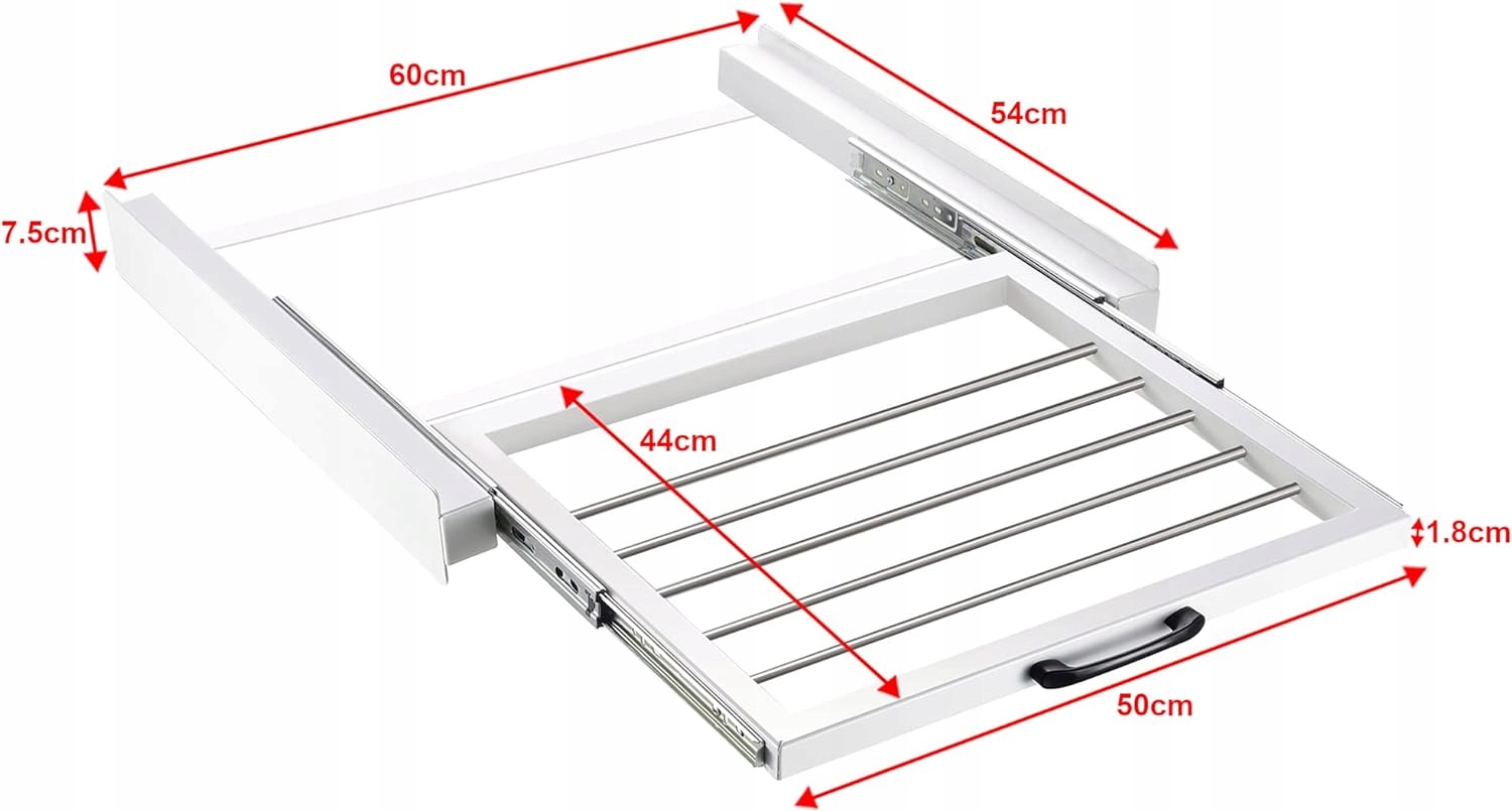 Розміри: Загальні розміри (В x Ш x Г): 7,5 x 60 x 54 см. Вішалка для рушників (В x Ш x Г): 1,8 x 50 x 44 см. Підходить для пристроїв шириною: 60 см. Довжина кріпильного пояса: 5 м. Вантажопідйомність: – сполучна рама: максимум 100 кг – вішалка для рушників: максимум 10 кг