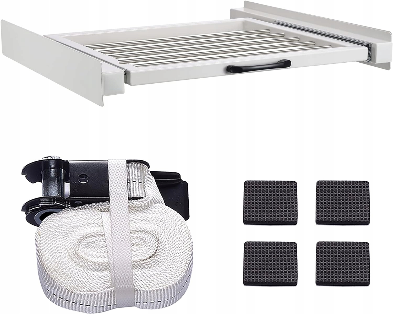 Деталі продукту: ідеально підходить для створення колони прально-сушильної машини. Універсальне використання для пральних і сушильних машин шириною 60 см. Висувна рушникосушка з ручкою також може використовуватися як полиця для кошика для білизни. Включає храповий ремінь для надійного кріплення. З 4 нековзкими накладками для стабільності