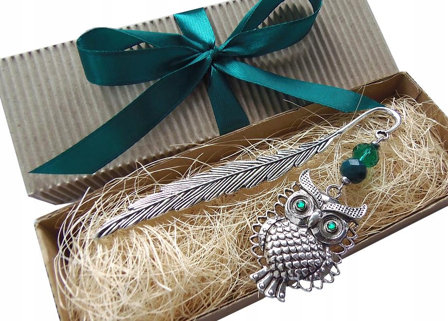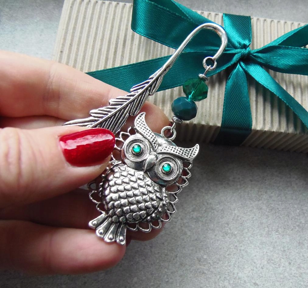 Закладка має форму пір'я, прикрашене красивою зеленоокою совою - символом знань, мудрості та скляними кристалами.