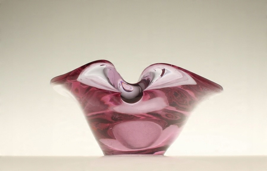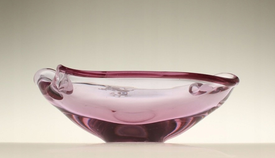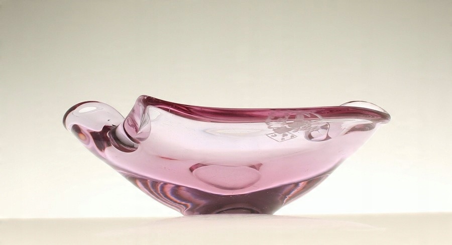 Попільничка ручного формування з натрієвого скла пофарбованого в рожевий колір в масі. Під одним із лицьових країв вигравірувано гроно винограду, сопілка та гральна карта. Імовірно, це один із проектів Мирослава Клінгера. Попільничка походить зі склозаводу в Железному Броді. Чехословаччина, 1960-ті роки.