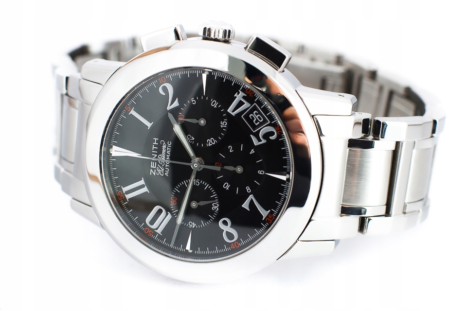 чорний. Підписано брендом і назвою моделі «Zenith El Primero» з опуклими сталевими індексами та стрілками, хронографом і допоміжним секундним циферблатом і дисплеєм дати.