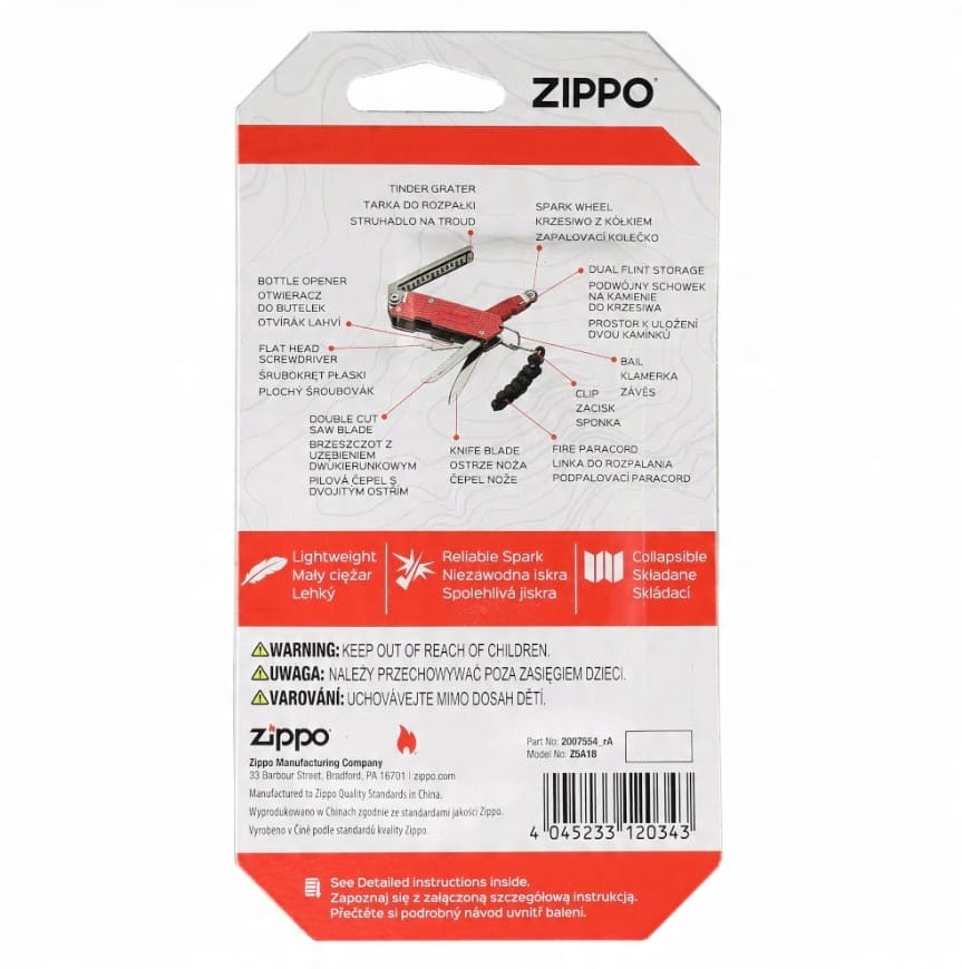 Тонкий, зручний багатофункціональний інструмент, який завжди варто мати з собою. Ідеально підходить для роботи поза домом. Мультиінструмент для розпалювання вогню це корисний продукт для розпалювання вогню. Він має всі елементи, необхідні для розпалювання та підтримки вогню. Вбудована терка для труту, ніж і пилки подрібнять трут і підготують матеріал для розпалу. Класичне кільце Zippo та кремінь із паракордом ідеально підходять для розпалювання вогню. Інструмент також містить викрутку та відкривачку для пляшок. Набір надзвичайної універсальності, ідеальний як практичний подарунок. Корпус має насичений червоний колір і підписаний великим логотипом компанії - гарантія оригінальності.