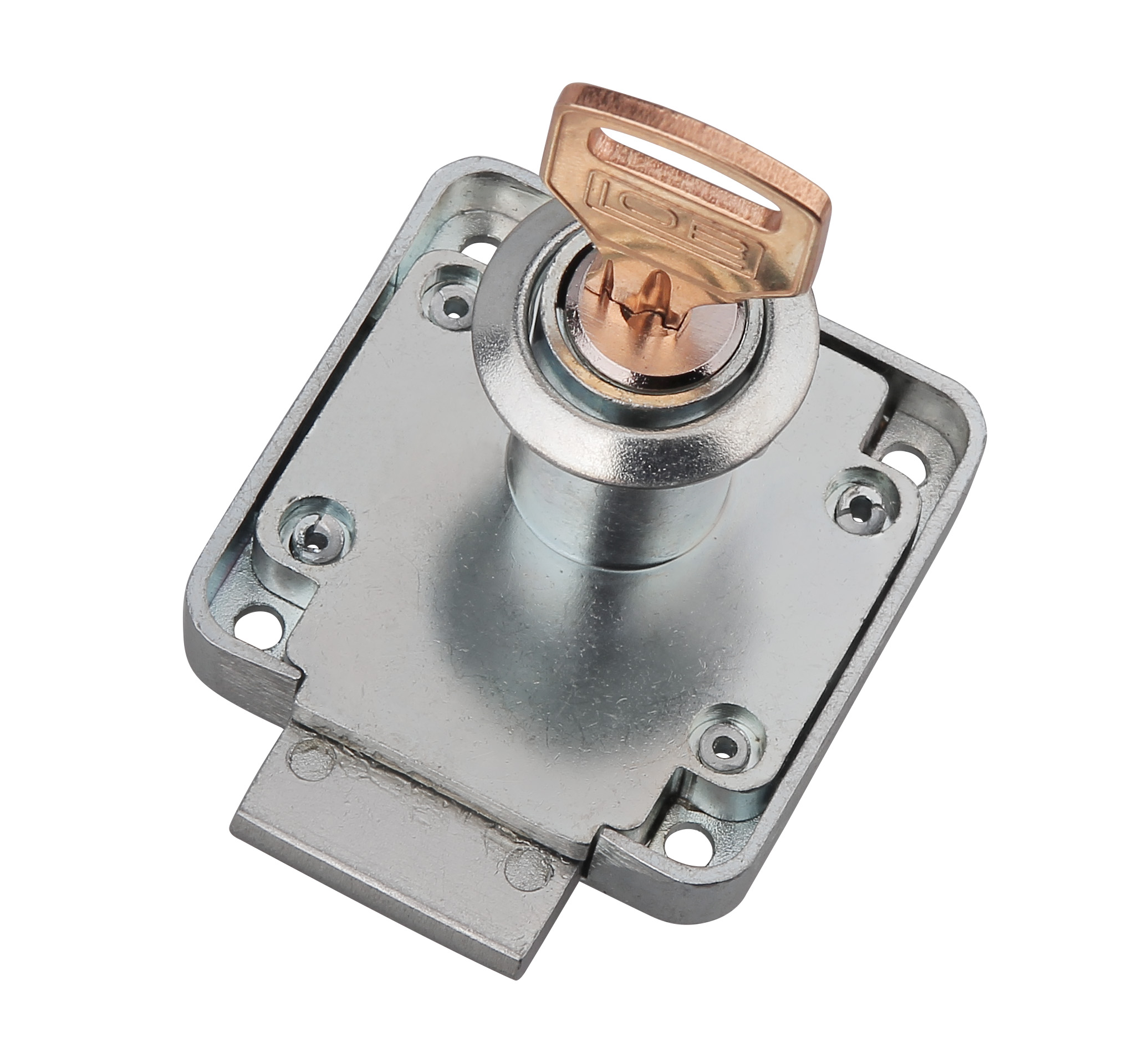 Опис: замок із сріблястого оцинкованого металу. Лицьова сторона замка, видима з боку ключа, нікельована. Має 2 ключа, закриваючий елемент - металевий язичок. Його можна використовувати в шухлядах, стійках, ящиках, шафах тощо і є універсальним замком. Встановлення замку передбачає просвердлювання отвору 16 мм на відстані 25 мм від краю дверей, вставлення циліндра зсередини та поворот замка. Потім підготуйте місце для фіксатора та загвинтіть його.