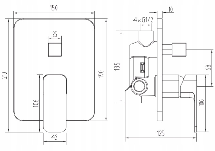 Два виходи змішаної води та два входи : для гарячої та холодної води