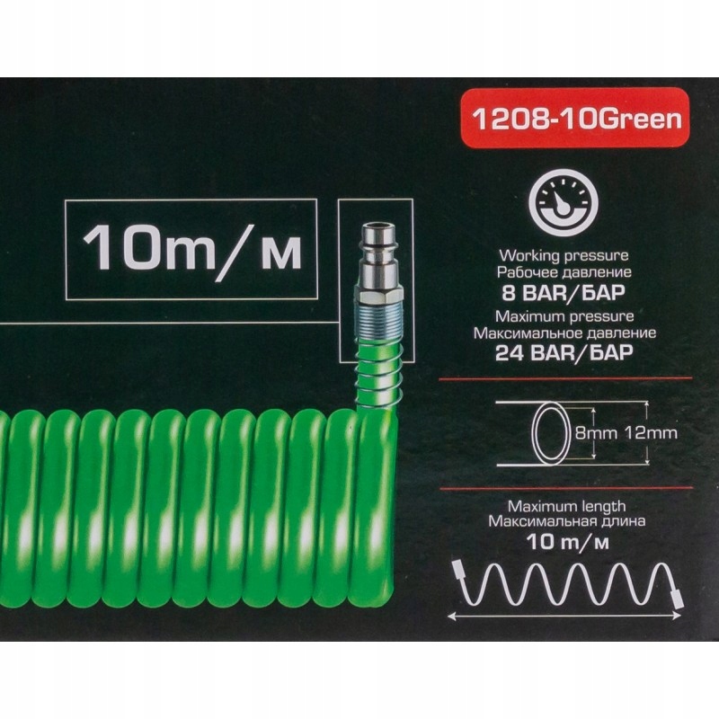 Пневматичний шланг оснащений додатковим захистом у вигляді сталевих пружин, які запобігають розтріскуванню змії в точках кріплення, внутрішнім діаметром 8 мм і зовнішнім діаметром 12 мм. Також завдяки зміцненню продукт витримує високий тиск стисненого повітря до 24 бар, робочий тиск 8 бар. Швидкі муфти виготовлені з латуні, стійкі до корозії та деформації. Поєднання швидких з'єднань забезпечує зручність та довговічність. Площа швидкого з'єднання зміцнюється, щоб уникнути вигинів і тріщин.
