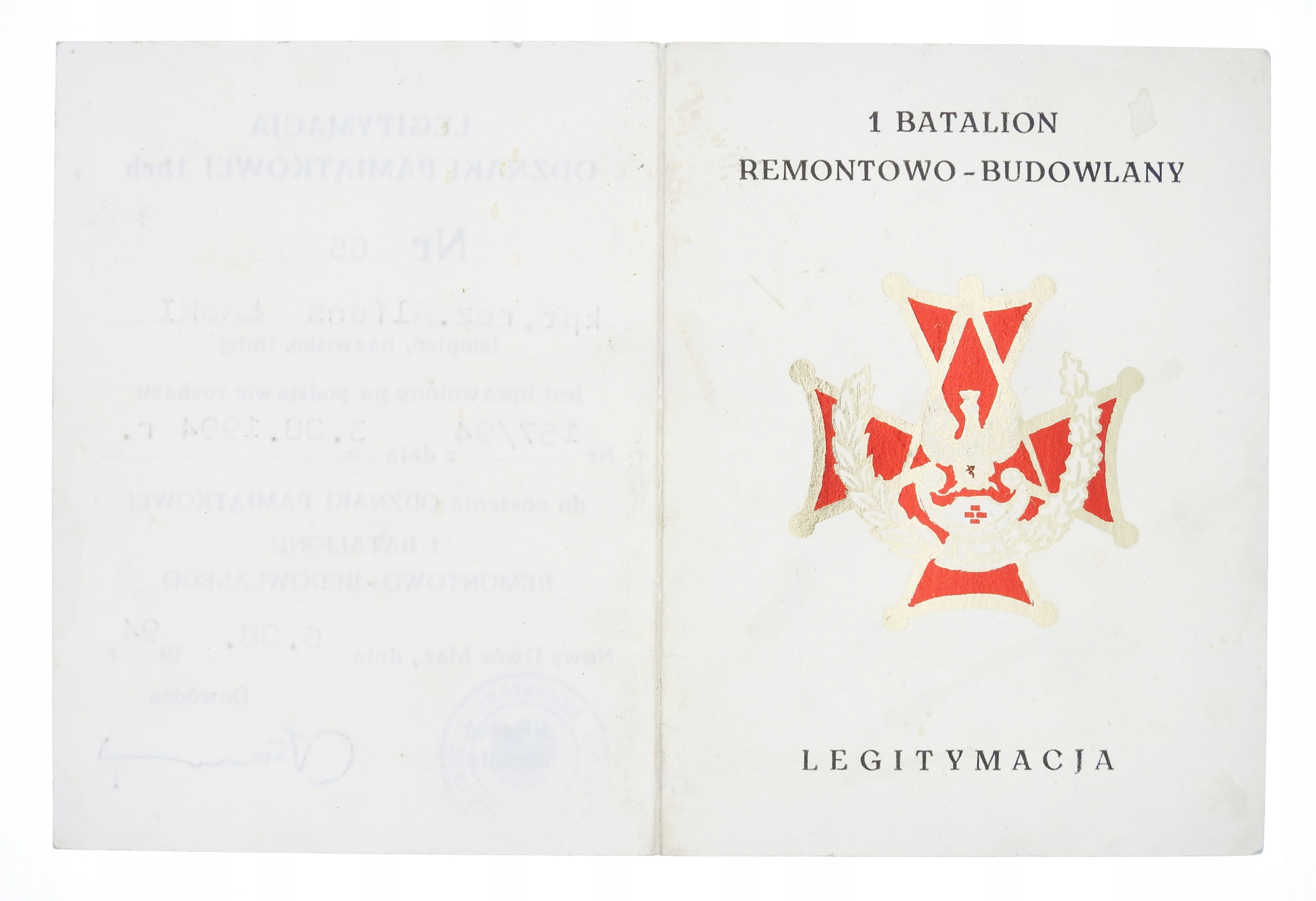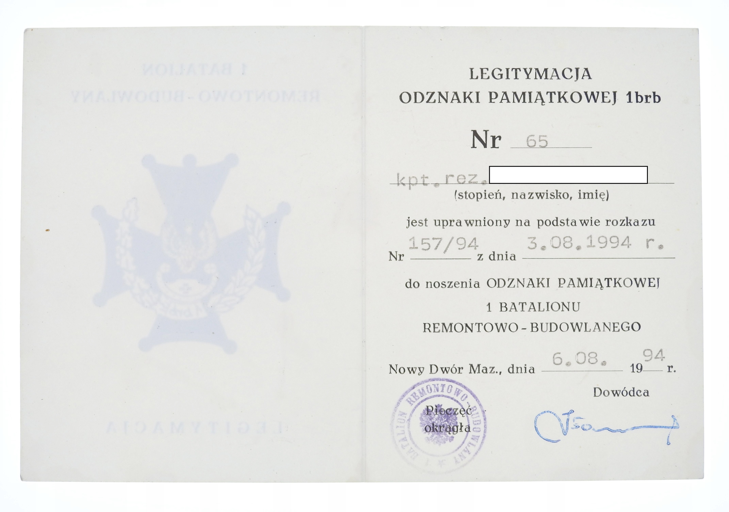 Батальйон значка 1 Батальйон реконструкція та будівництво - Nowy Dwór Mazowiecki - разом з посвідченням особи з 1994 р.
