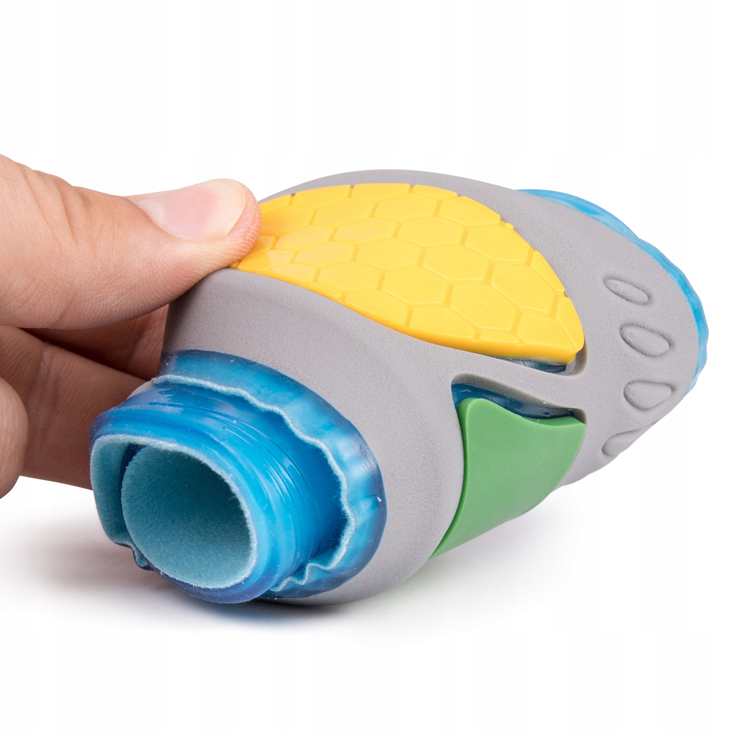 Сірий елемент - жорсткий силікон - підвищує стійкість стопи і утримує п'яту в правій частині. положення. Він запобігає зміщенню п’яти вбік, запобігаючи вальгусу стопи.