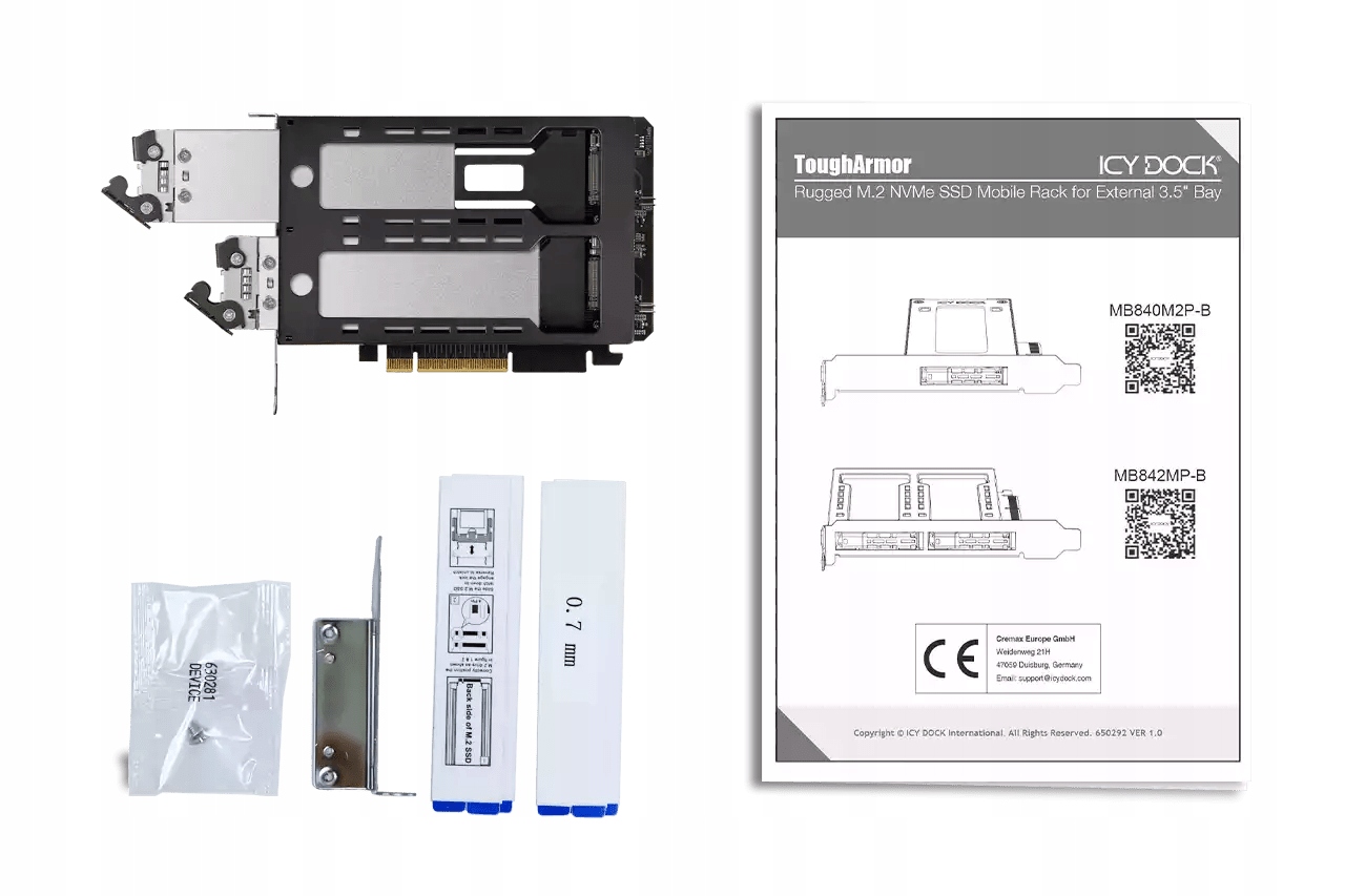 ToughArmor MB842MP-B перетворює слот розширення PCIe 8x або 16x у знімний корпус із відсіком з двома відсіками для дисків M.2 NVMe. Це дає змогу замінити SSD M.2 NVMe, не відкриваючи корпус комп’ютера.