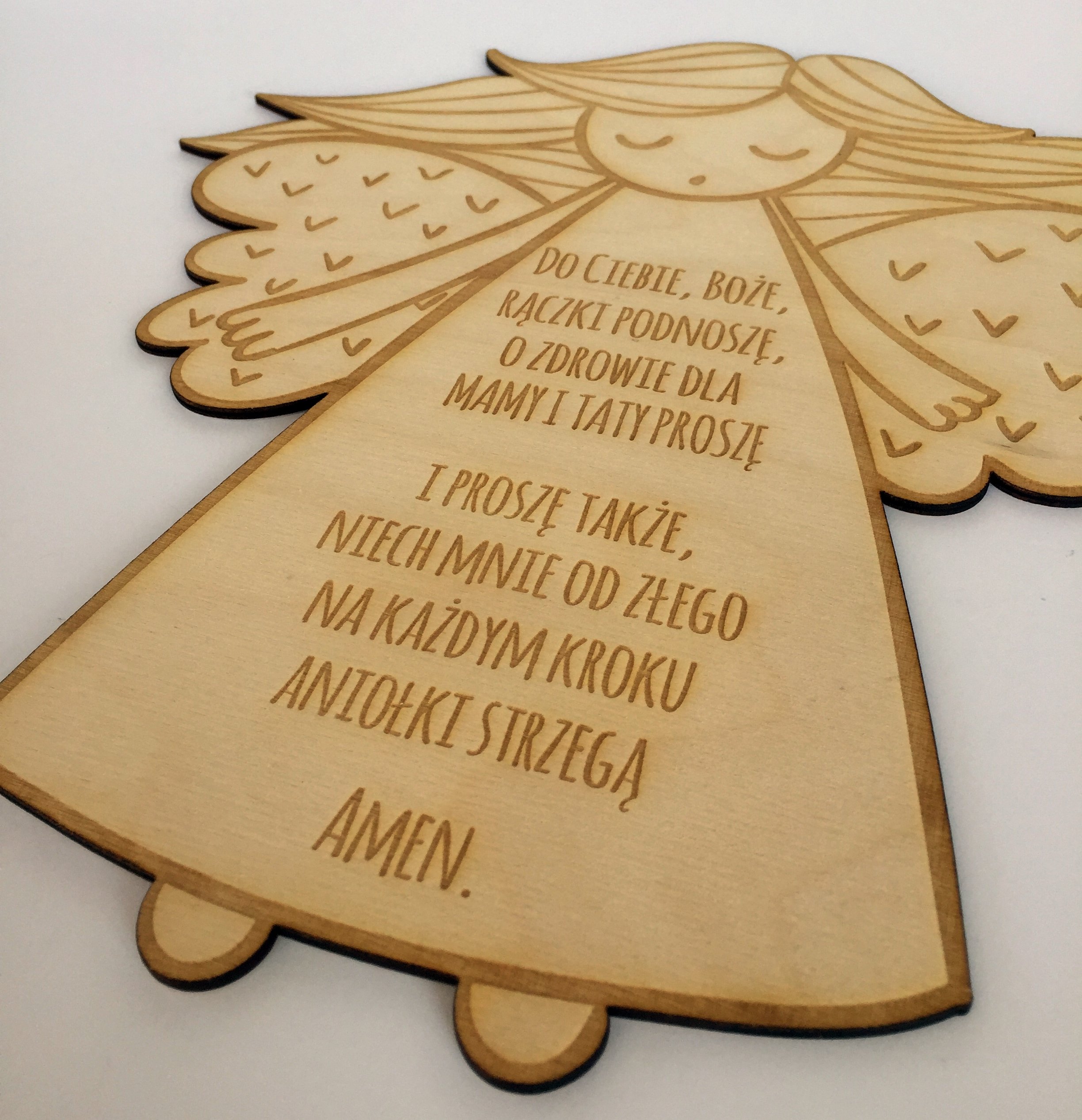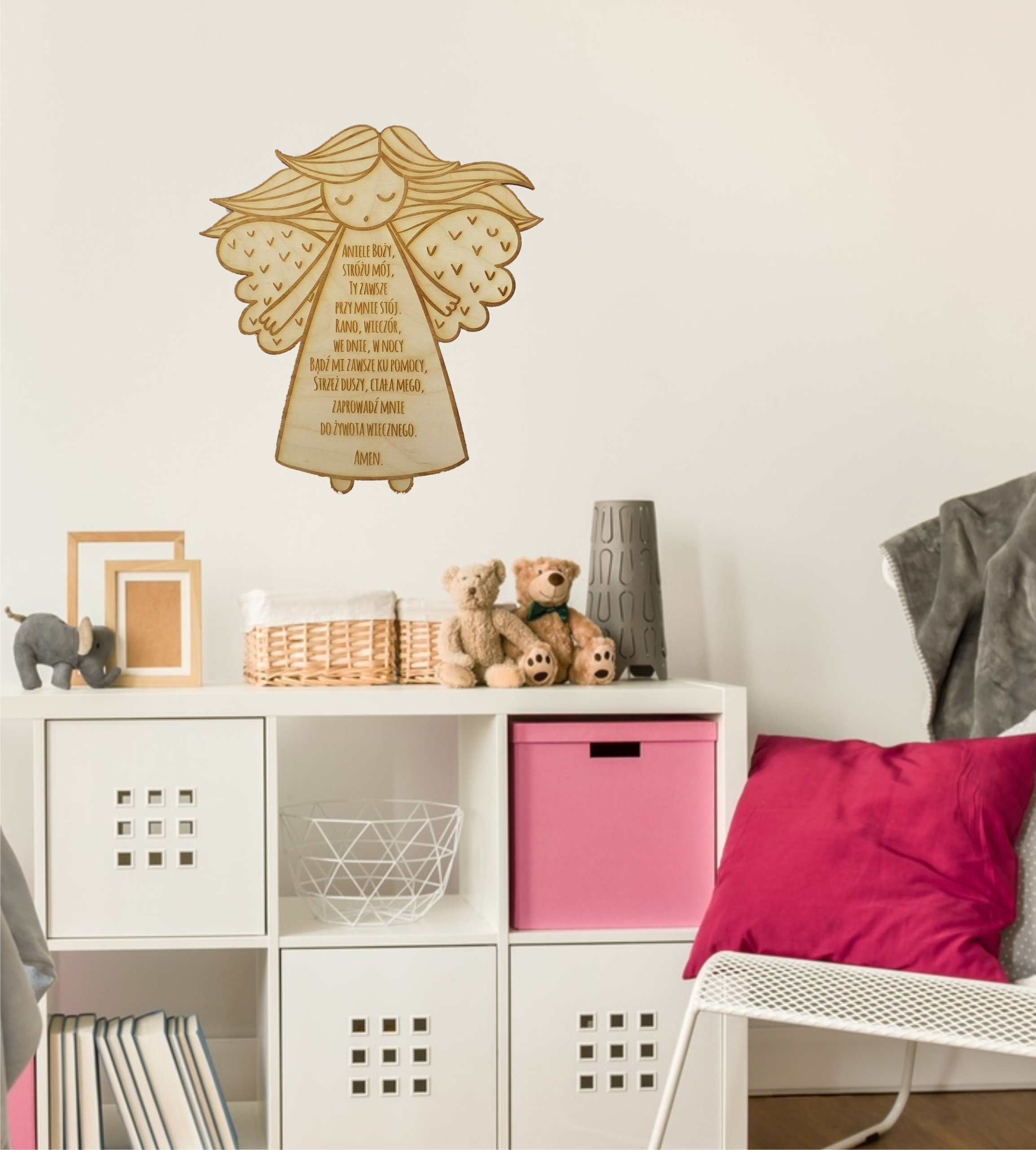 Гарний ангел із вигравіруваною молитвою на вибір. Чудовий декоративний елемент, який ідеально підходить як подарунок до першого візиту дитини, хрещення або дня народження.
