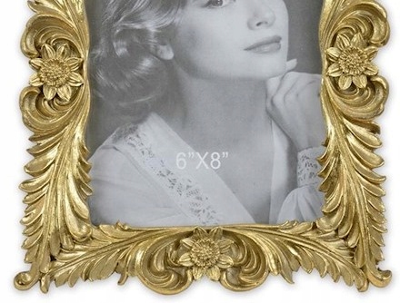 Приваблива фоторамка. Сучасний виготовлений із смоли золотого кольору, прикрашений чудовим декором. Завдяки своїй чудовій формі розміщена в ньому фотографія виглядає елегантно, і все це неодмінно стане прикрасою вашого дому або чудовим подарунком. Рамка оснащена опорою ззаду.