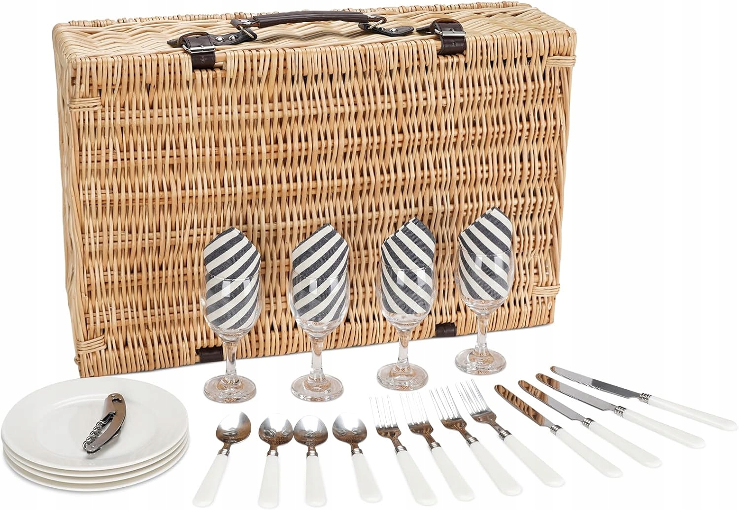 - плетений кошик для пікніка для 4 осіб. Розміри: 44 см х 34 см х 20 см. Розкішні штучні шкіряні смужки, які допомагають захистити елементи, тому страху перед рухом немає, адже всі столові прилади та аксесуари прикріплені до кошика.