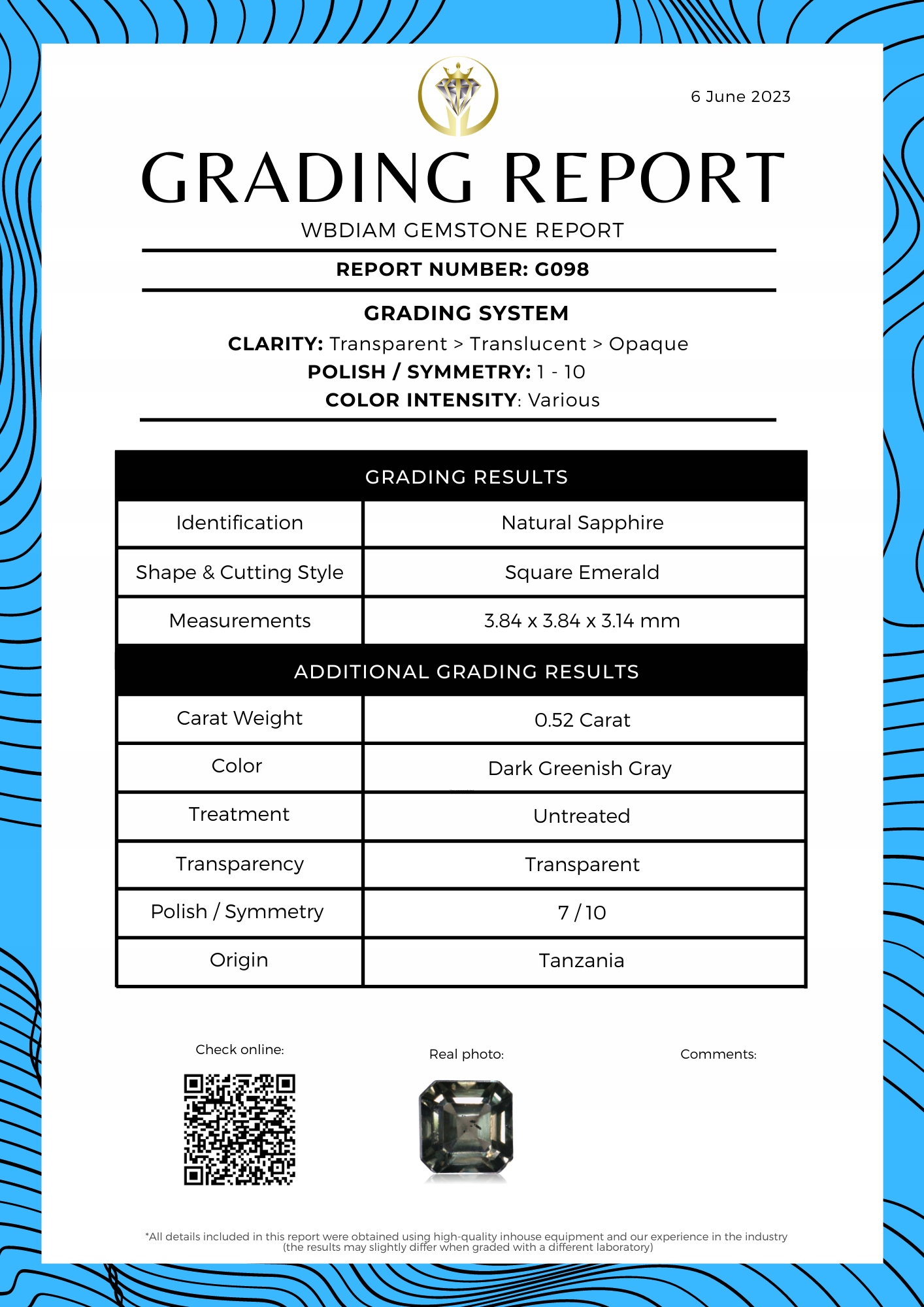 Сертифіковано WBDIAM - ЗВІТ №: G098 - сертифікат надається в цифровій формі (PDF)