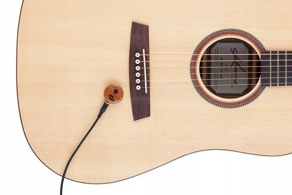 Пропонований п'єзоелектричний звукознімач з потенціометром для регулювання рівня гучності призначений для гітар, укулеле та інших інструментів з резонансний ящик. Дуже проста збірка, просто знайдіть потрібне місце на плоскій поверхні деки, де вам найбільше сподобається звучання інструменту, а потім прикріпіть його за допомогою двостороннього скотча або пластиліну, що входить в комплект. Немає необхідності знімати його, коли він не використовується. Адаптер поставляється з кабелем з маленьким роз’ємом 3,5 мм на одному кінці та типовим роз’ємом 6,3 мм на іншому.
